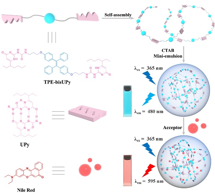 近日,我院孫小強(qiáng)/王樂(lè)勇聯(lián)合團(tuán)隊(duì)青年教師肖唐鑫博士在Chemical Communications上發(fā)表研究論文(DOI: 10.1039/D0CC05077F)。光合作用是自然界的普遍現(xiàn)象,是一切生命的基礎(chǔ)。模擬光合作用的光能捕獲和能量轉(zhuǎn)移過(guò)程具有重大意義。本論文利用TPE基團(tuán)橋連的雙UPy化合物作為天線分子和給體,通過(guò)四重氫鍵形成超分子聚合物,并進(jìn)一步在水溶液中通過(guò)微乳化組裝成超分子納米顆粒,并負(fù)載NiR染料作為能量受體,構(gòu)筑了一個(gè)基于水相的超分子光捕獲體系,并展現(xiàn)出高效的能量轉(zhuǎn)移效率和天線效應(yīng)以及顏色可調(diào)的發(fā)光功能。