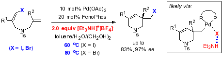 該課題組把這種研究策略稱之為氫鍵作用促進的還原消除,該策略確保常規(guī)的手性FerroPhos膦配體就能實現(xiàn)優(yōu)秀的不對稱烯烴碳碘化反應(yīng),同時第一次實現(xiàn)了不對稱烯烴碳溴化反應(yīng)。通過實驗和理論計算研究,首次清晰的描繪了烷基鹵代烴還原消除反應(yīng)的整個歷程,修正了僅受熱力學(xué)控制的傳統(tǒng)認知,加深了對該基元反應(yīng)的理解。其中的氫鍵策略相信能促進和推動該基元反應(yīng)在有機合成的應(yīng)用。