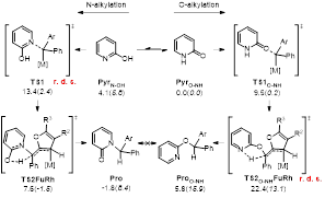 由于2-吡啶酮在溶液中有吡啶酮和羥基吡啶兩種形式存在,為兩可親核試劑,即既有氧親核性也有氮親核性,且由于氧的電負(fù)性較大,此前的吡啶酮卡賓插入反應(yīng)也以O(shè)-H鍵插入為主。我們通過(guò)計(jì)算揭示了此反應(yīng)的極高的氮選擇性反應(yīng)機(jī)理。