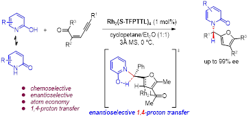 在前期工作基礎(chǔ)上,孫江濤課題組和北京大學(xué)深圳研究院的張欣豪課題組合作,以烯炔酮為卡賓前體,吡啶酮為親核試劑,實(shí)現(xiàn)了呋喃卡賓的N-H鍵插入反應(yīng)。也是第一次實(shí)現(xiàn)了給體卡賓的N-H鍵插入反應(yīng),通過(guò)計(jì)算揭示了全新的不對(duì)稱1,4-質(zhì)子轉(zhuǎn)移機(jī)理。