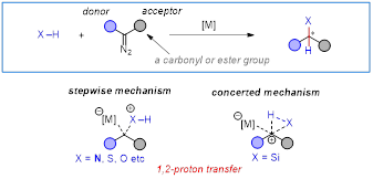 不對(duì)稱金屬卡賓插入X-H鍵反應(yīng)是構(gòu)建手性C-X常用的方法。一般來(lái)說(shuō),此類反應(yīng)對(duì)底物有較多限制,比如卡賓前體是既有給電子基團(tuán)也有吸電子基團(tuán),而吸電子基團(tuán)如羧酸酯的存在來(lái)穩(wěn)定卡賓中間體使反應(yīng)得以順利實(shí)現(xiàn)。反應(yīng)機(jī)理也大多以1,2-質(zhì)子遷移為主。