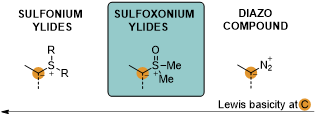 锍葉立德作為兩性離子化合物,一般需要在葉立德Cα-位引入吸電子基來(lái)穩(wěn)定其存在。此外,根據(jù)硫原子氧化態(tài)的不同,可以分為sulfonium ylide(正锍葉立德)與sulfoxonium ylide(氧化锍葉立德)兩大類。電負(fù)性氧原子的引入,不僅使得氧化锍葉立德的葉立德碳Lewis堿性降低,而且具Lewis堿性的氧原子或副產(chǎn)物DMSO容易與手性催化劑結(jié)合,從而可能對(duì)反應(yīng)過(guò)程中的手性誘導(dǎo)產(chǎn)生干擾。但與正锍葉立德以及類似的重氮化合物相比,氧化锍葉立德具有良好的穩(wěn)定性,之前報(bào)道的絕大多數(shù)文獻(xiàn)都將其作為重氮化合物的替代物經(jīng)金屬卡賓中間體應(yīng)用于有機(jī)合成。因此,發(fā)展基于锍葉立德不對(duì)稱催化研究具有重要意義。