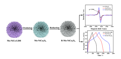 近年來(lái),過(guò)渡金屬氧化物以其可變的氧化價(jià)態(tài),成本低廉,易于制備而引起廣泛關(guān)注。此外,鑒于過(guò)渡金屬氧化物的理論比電容較高且電活性較好,故而在儲(chǔ)能領(lǐng)域具有重要地位。在本工作中,課題組提出了一種雙缺陷工藝構(gòu)建富含氧空位和Mo摻雜的NiCo2O4(R-Mo-NiCo2O4)。通過(guò)NaBH4還原在NiCo2O4晶格中產(chǎn)生氧空位缺陷,在材料中產(chǎn)生更多的載流子,使更多活性物質(zhì)參與電化學(xué)氧化還原反應(yīng)過(guò)程。此外,氧空位和Mo摻雜的協(xié)同作用不僅提高了材料的導(dǎo)電性,而且豐富了氧化還原動(dòng)力學(xué)。將通過(guò)氧空位和Mo摻雜雙缺陷工藝制備得到的R-Mo-NiCo2O4用做超級(jí)電容器電極,在電流密度1 A g?1下比容量高達(dá)285.8 mAh g?1,且具有較好的倍率性能及循環(huán)穩(wěn)定性。該電極材料優(yōu)異的性能可歸因于R-Mo-NiCo2O4較大的比表面積可增加其與電解質(zhì)的接觸面積,實(shí)現(xiàn)電解質(zhì)充分?jǐn)U散的同時(shí)縮短了電荷轉(zhuǎn)移的擴(kuò)散路徑;Mo元素的引入促進(jìn)了電荷轉(zhuǎn)移,提高了R-Mo-NiCo2O4的導(dǎo)電性,同時(shí)Mo元素的引入有助于形成氧空位缺陷,促進(jìn)離子在電極中的擴(kuò)散;經(jīng)NaBH4還原后,氧空位缺陷的數(shù)量可進(jìn)一步增加,提升了該電極材料的電化學(xué)性能。該成果于近日發(fā)表于化學(xué)領(lǐng)域著名期刊Chemical Communications (2022, 58, 5120–5123)。