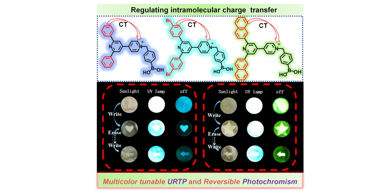 動態(tài)光致變色長壽命室溫磷光材料是一類兼具結(jié)構(gòu)色變化與發(fā)光特性可調(diào)(強(qiáng)度、壽命及顏色)的智能光學(xué)材料,在高級防偽、信息加密、傳感等領(lǐng)域具有巨大應(yīng)用潛能。然而,如何將光致變色和長壽命室溫磷光功能有效整合到單一聚合物體系,以構(gòu)筑出多色可調(diào)的高性能的動態(tài)光致變色長壽命室溫磷光聚合物,仍面臨巨大挑戰(zhàn)。我們研究團(tuán)隊(duì)策略性地將具有可調(diào)控分子內(nèi)電荷轉(zhuǎn)移(ICT)能力的非線性吡啶鎓單元嵌入剛性聚乙烯醇(PVA)基質(zhì)中,成功地開發(fā)了多色可調(diào)的動態(tài)光致變色長壽命室溫磷光聚合物。