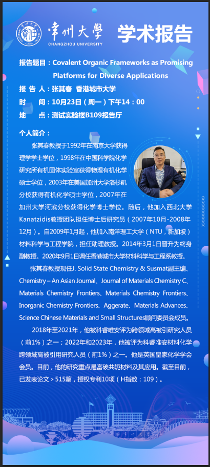 【學術報告】10月23日學術報告——張其春教授,香港城市大學