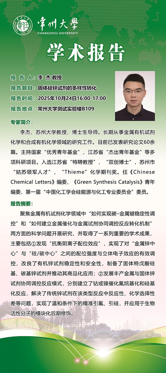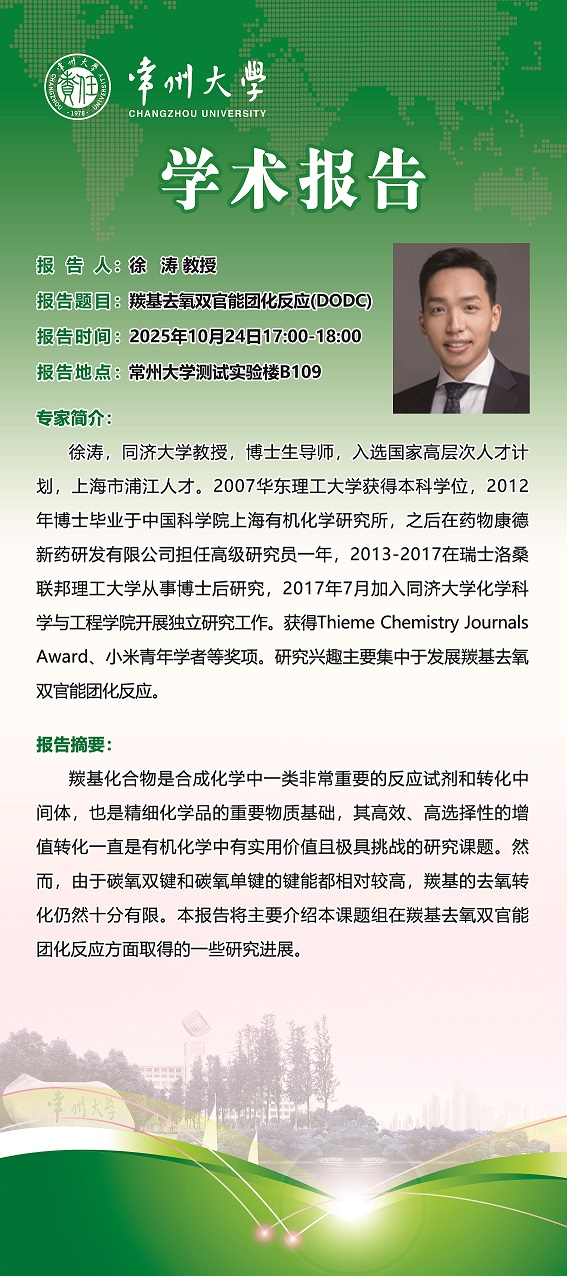 | 【學(xué)術(shù)報(bào)告】10月24日功能雜環(huán)研究院學(xué)術(shù)報(bào)告——李杰教授 蘇州大學(xué) 徐濤教授 同濟(jì)大學(xué) |